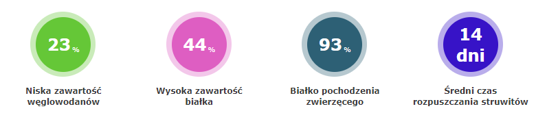 - niską zawartość substancji mineralnych, jak również składniki wiążące minerały np. chitozan i cytrynian potasu, co ogranicza ich stężenie w moczu