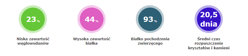 - białka pochodzenia zwierzęcego bogate w aminokwasy siarkowe sprzyjające normalizacji poziomu pH moczu.