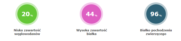 • Niska zawartość węglowodanów o niskim indeksie glikemicznym oraz wysoka zawartość białka utrzymuje stałe, niskie, poposiłkowe stężenie glukozy we krwi, stabilne wydzielanie insuliny oraz zmniejsza insulinooporność.